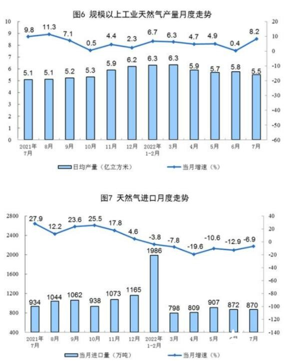 1—7月份,生產天然氣1267億立方米,同比增長5.4%。進口天然氣6221萬噸,同比下降9.6%。