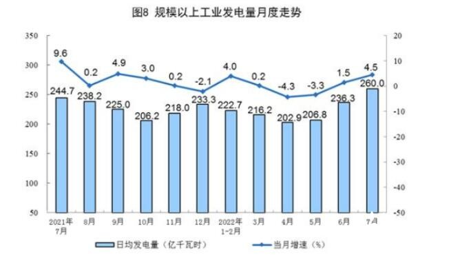 電力生產增速加快。7月份,發電8059億千瓦時,同比增長4.5%,增速比上月加快3.0個百分點,日均發電260.0億千瓦時。1—7月份,發電4.77萬億千瓦時,同比增長1.4%。