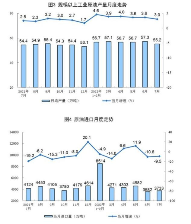 1—7月份,生產原油12000萬噸,同比增長3.7%。進口原油28984萬噸,同比下降4.0%。