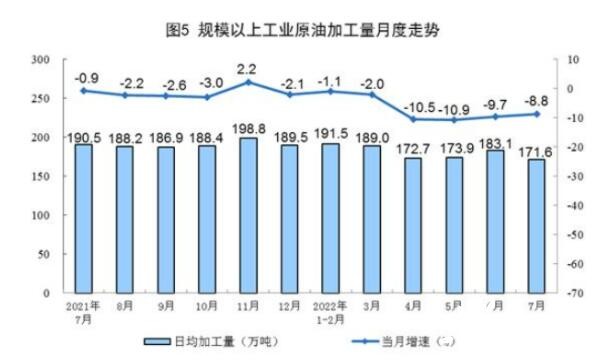 原油加工量降幅收窄。7月份,加工原油5321萬噸,同比下降8.8%,降幅比上月收窄0.9個百分點,日均加工171.6萬噸。1—7月份,加工原油38027萬噸,同比下降6.3%。