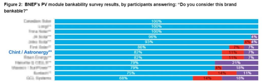據悉,今年彭博新能源財經(BNEF)的調研涉及機構融資的光伏項目裝機量涵蓋全球557GW。收集了來自全球28家銀行、基金、太陽能工程承包商、獨立發電廠商和技術顧問的調查結果,并與質量檢測及技術專家進行深度訪談后得出的結果。該報告是以公司的財務健康狀況、光伏組件和逆變器在項目上的跟蹤數據以及制造廠商的質保為重要評估指標。調查覆蓋范圍廣,評估公開透明,是眾多金融機構在商業信貸方面的重要參考依據。