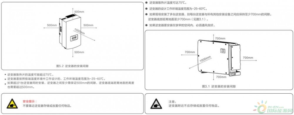 多臺逆變器安裝時,安裝距離也非常重要,這決定了逆變器散熱性能和風扇工作效率。若距離較小,風扇工作頻率增加,且散熱也不理想,則會導(dǎo)致系統(tǒng)發(fā)電量受影響。不同逆變器安裝距離不同,建議參考錦浪科技相應(yīng)產(chǎn)品說明書: