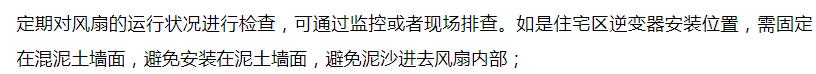 要保障逆變器散熱風扇正常運行,前期合理的安裝和后期排查運維必不可少,首先需要避免有異物積累的安裝環(huán)境或者添加保護機制,并定期通過監(jiān)控和現(xiàn)場排查及時清理和更換風扇,以保障逆變器正常運行。