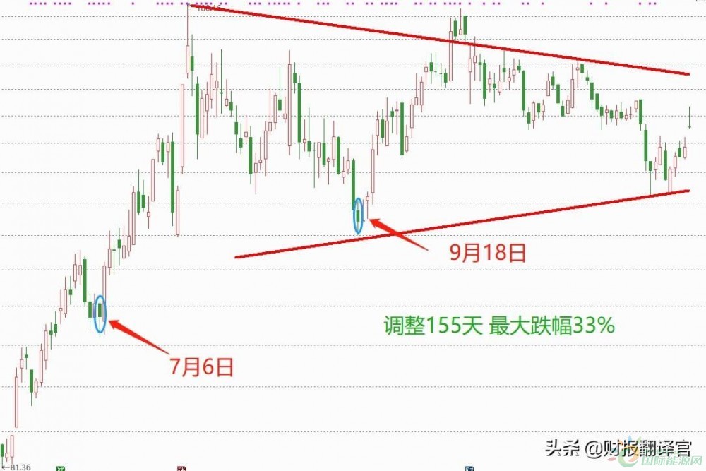 這家公司的股票目前正處在對稱三角形的調(diào)整形態(tài)中,股價(jià)在155天內(nèi)已經(jīng)大幅回調(diào)了33%。