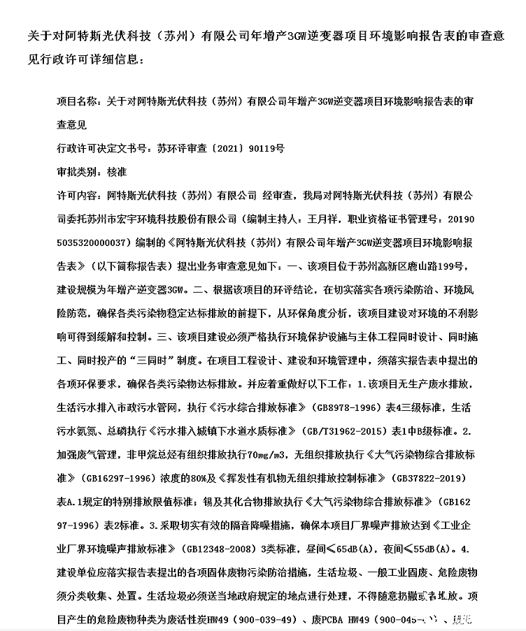 蘇州生態(tài)環(huán)境局發(fā)布關(guān)于對阿特斯年增產(chǎn)3GW逆變器項目環(huán)境影響報告表的審查意見行政許可詳情信息,審批類別:核準(zhǔn),擴建3GW逆變器,總投資金額1080萬元,施工工期1個月。自此,阿特斯將正式進軍逆變器領(lǐng)域。阿特斯曾官宣承接設(shè)計服務(wù),進軍光伏媒體圈。
