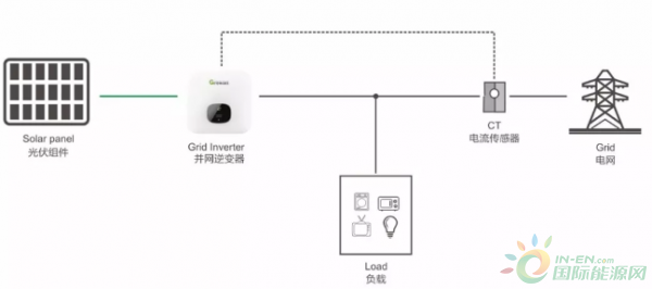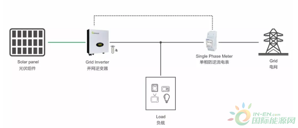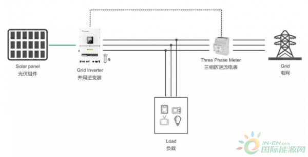 目前行業內有兩種解決方案:一是加防逆流裝置,在并網點安裝電表或者電流傳感器,當檢測到有電流流向電網時,降低逆變器輸出功率;二是加裝儲能裝置,也是在并網點安裝電表或者電流傳感器,當檢測到有電流流向電網時,逆變器輸出功率不變,啟動雙向變流器,把多出的電能儲存在蓄電池中,等光伏功率下降或者負載功率增大時再放出來。