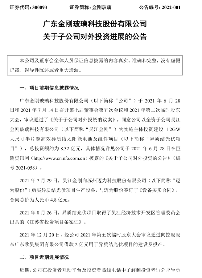 2021 年 6 月 28日和 2021 年 7 月 14 日金剛玻璃召開第七屆董事會第五次會議和 2021 年第二次臨時股東大會,審議通過了《關于子公司對外投資的議案》,同意公司以全資子公司吳江金剛玻璃科技有限公司為實施主體投資建設 1.2GW大尺寸半片超高效異質結太陽能電池及組件項目。