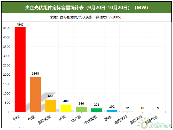 國際能源網(wǎng)/光伏頭條(PV-2005)根據(jù)公開招中標信息梳理發(fā)現(xiàn),9月20日-10月20日,央企定標項目(標段)數(shù)為42個,占項目總數(shù)的82.35%;定標容量為8.08GW,約占總定標容量的92.85%。