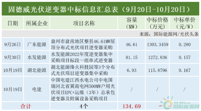 固德威本統(tǒng)計周期中標廣東能源、水發(fā)能源、湖北能源以及中國電建等企業(yè)4個項目,合計容量134.69 MW。