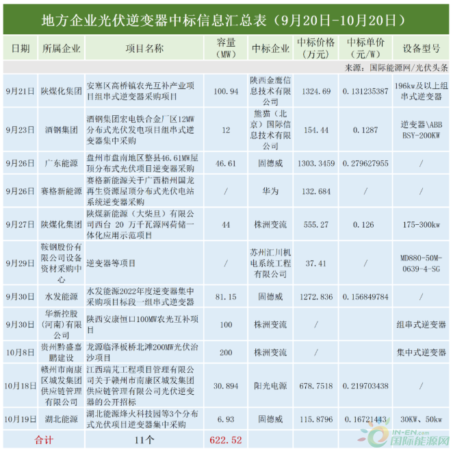 地方企業(yè)方面,據(jù)國際能源網(wǎng)/光伏頭條(PV-2005)統(tǒng)計,有11個項目定標,確定定標容量622.52MW。固德威、華為、陽光電源、株洲變流等企業(yè)成為最終贏家。
