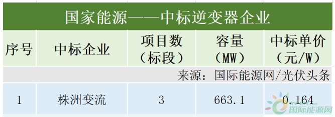 國家能源集團有3個項目(標段)定標,合計容量663.1MW。值得關(guān)注的是,株洲變流中標國家能源集團所有3個項目(標段),其中有一個項目披露了中標價格,單價為0.164元/W。