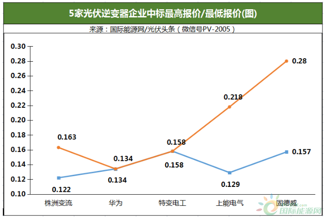 最高中標價出自廣東能源的盤州市盤南地區(qū)整縣46.61MW屋頂分布式光伏項目逆變器采購。固德威中標價為1303.3459萬元,折合單價0.28元/W。