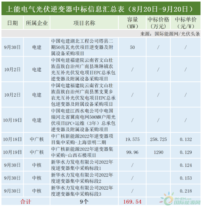 其中,本統(tǒng)計周期容量最大的定標項目出自中核集團。10月11日,中核集團旗下新華水力發(fā)電有限公司2022年度逆變器集中采購項目定標。該項目分為3個標段,合計采購容量4500MW,合計有7家企業(yè)入圍中標人名單。其中上能電氣與科華數(shù)據(jù)中標三個標段。陽光電源與株洲變流各中標兩個標段。