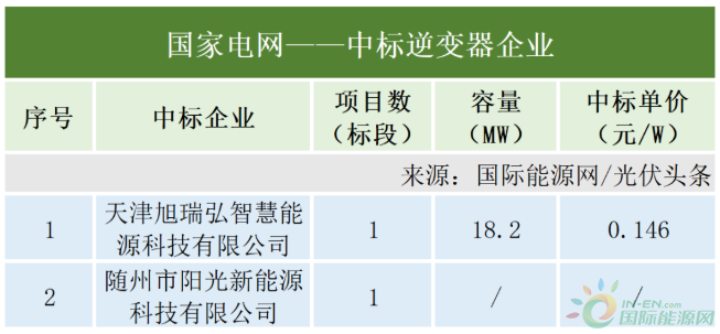 國家電網(wǎng)有2個項目定標,確定定標容量18.2MW。天津旭瑞弘智慧能源科技有限公司、隨州市陽光新能源科技有限公司為兩個項目的中標人。