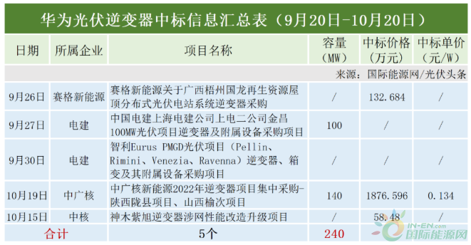 其中,確定中標價格的項目為中廣核新能源2022年逆變器項目集中采購-陜西隴縣項目、山西榆次項目。該項目采購容量140MW,華為是唯一中標人,投標報價1876.596萬元,折合單價0.134元/W。