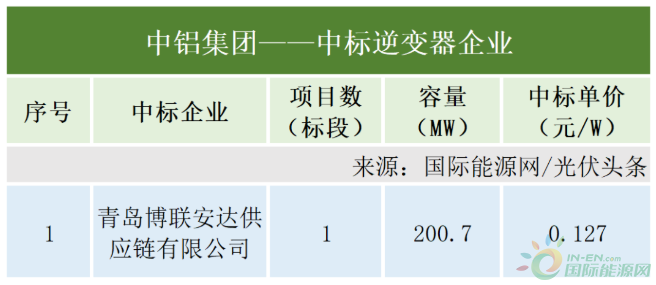 中鋁集團有1個逆變器采購項目定標,容量為200.7MW。青島博聯(lián)安達供應鏈有限公司作為中標人,中標價格為0.127元/W。