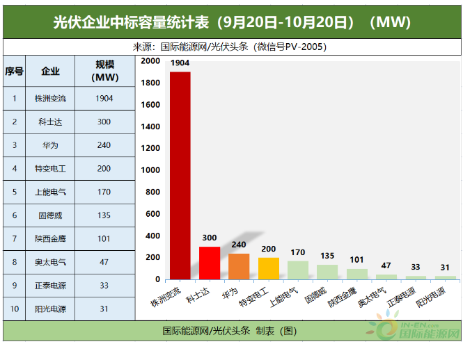 國際能源網(wǎng)/光伏頭條(PV-2005)統(tǒng)計,9月20日-10月20日國內(nèi)逆變器招投標市場,株洲變流、華為、陽光電源、特變電工、上能電氣、科華數(shù)據(jù)、固德威、特變電工、正泰電源等25家企業(yè),共同贏得了8.71GW的逆變器招標采購訂單。