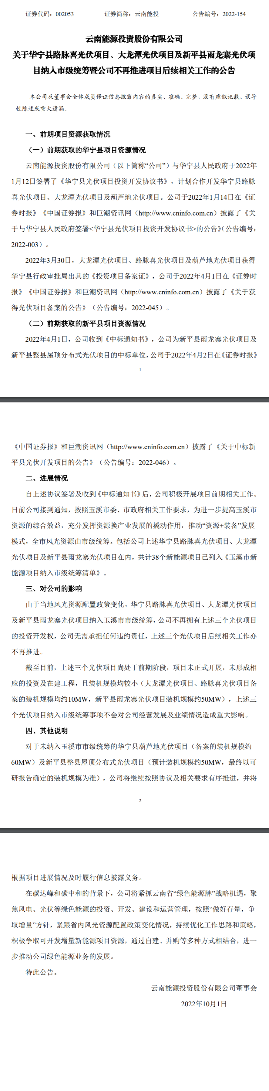 由于當(dāng)?shù)仫L(fēng)光資源配置政策變化,華寧縣路脈喜光伏項目、大龍?zhí)豆夥椖考靶缕娇h雨龍寨光伏項目納入玉溪市市級統(tǒng)籌,云南能投不再擁有上述三個光伏項目的投資開發(fā)權(quán),上述三個光伏項目后續(xù)相關(guān)工作亦不再推進(jìn)。