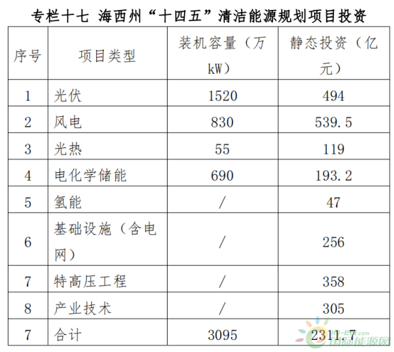 投資情況方面,海西州“十四五”規(guī)劃推薦方案光伏新增1520萬(wàn)千瓦,投資需求約494億元;風(fēng)電新增830萬(wàn)千瓦,投資需求約539.5.5億元,光熱55萬(wàn)千瓦,投資需求約119億元;新能源發(fā)電配套電化學(xué)儲(chǔ)能投資約193.2億元;基礎(chǔ)設(shè)施投資約256億元;特高壓外送通道工程投資約358億元;清潔能源配套產(chǎn)業(yè)和技術(shù)研究投資約305億元。“十四五”規(guī)劃新增各類項(xiàng)目總投資合計(jì)約2311.7億元。